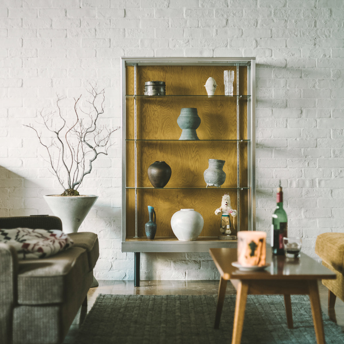 Although glass cases have a strong showcase image, this product is made of wood with a warm back panel, making it suitable for use in living rooms and bedrooms.