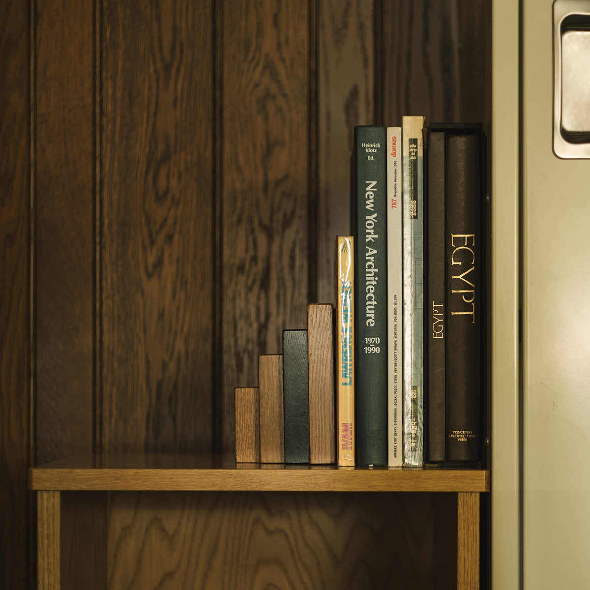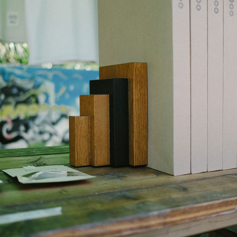 家具を作る際に余った無垢の端材を使用した、P.F.S.オリジナルの木製ブックエンドです。