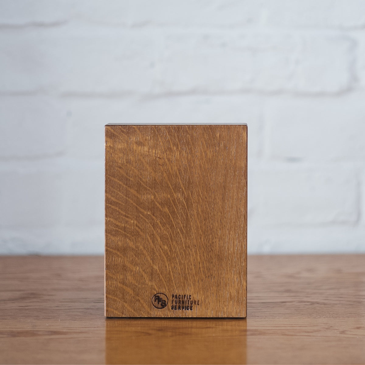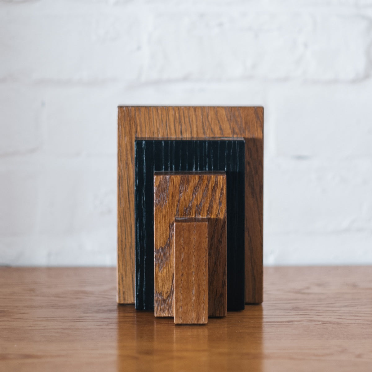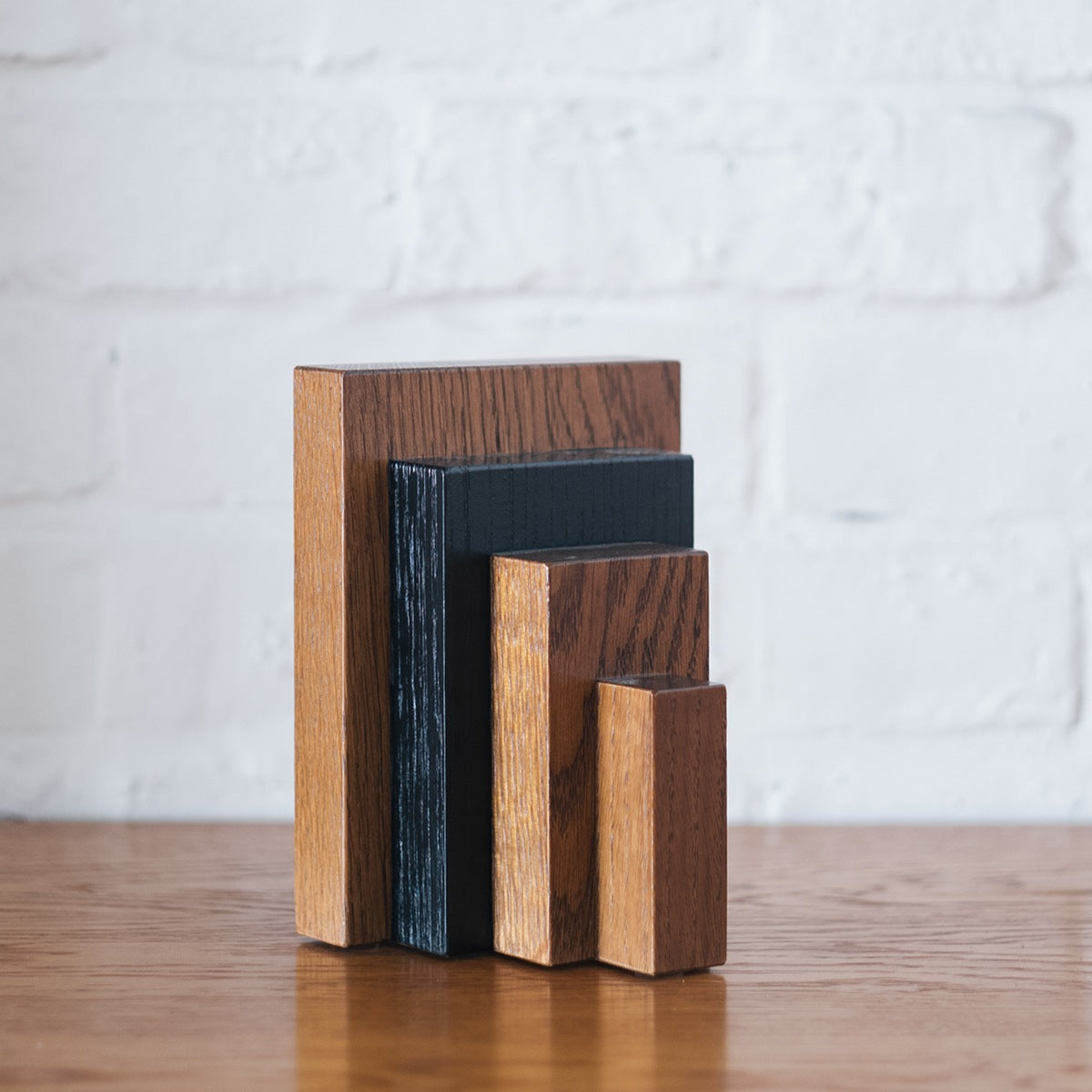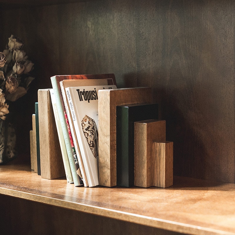 P.F.S. crafts original wooden bookends using leftover solid wood from the furniture making process.